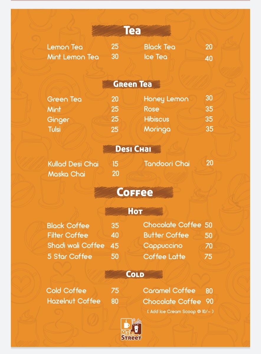 Welcome to Cafe MainStreet, nestled in the vibrant heart of Okhla on Main Road, a delightful haven where culinary dreams come true. This charming cafe boasts a diverse and tantalizing menu that is sure to captivate your taste buds. Whether you are sipping on a refreshing Lemon Tea or indulging in the rich flavors of their signature Shadi Wali Coffee, there's something for everyone.